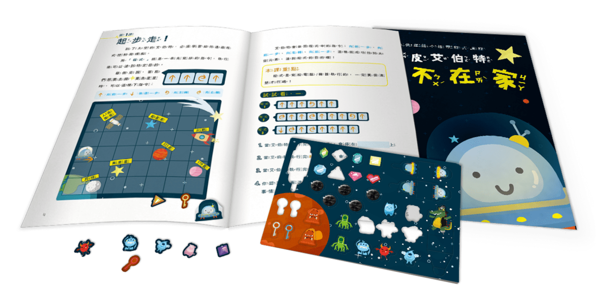 《頑皮艾伯特不在家》不但有生動的故事及精美的插圖,甚至貼心地附上了注音。本書的劇情中有許多任務,孩子需要用符號代表程式碼,在課本上畫下一個個的符號,成為完整的程式。教材的靈感來自「圖靈機」模型,由電腦科學之父-艾倫圖靈所提出,奠定了電腦科學的理論基礎,可說是「沒有圖靈機,就不會有現在的電腦」。